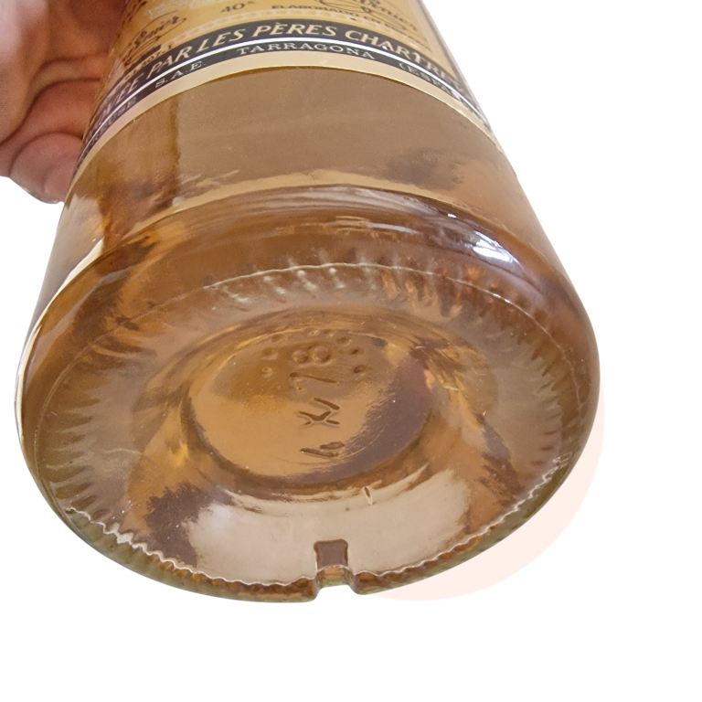 Botella de Chartreuse amarillo producido en la fábrica de Tarragona. Periodo de fabricación entre el 1978 y el 1985. Conocido en la época Capacidad de 75cl, con una graduación de 40⁰. Precinto fiscal de 8 pesetas. Excepcional nivel de llenado, sin ningún tipo de evaporación del licor. Ideal para colección o degustación.