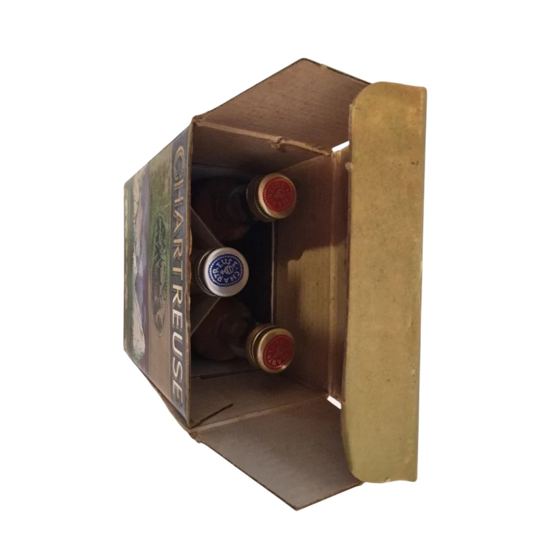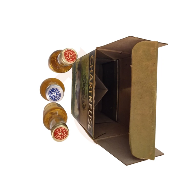 Caja completa de 3 botellines o mignonettes de Chartreuse amarillo, verde y anisette elaboradas en Tarragona. Periodo de fabricación entre los años 1978-1985. Capacidad de 3cl, con una graduación de 22⁰, 40⁰ y 55⁰. Nivel de llenado del licor y de conservación buenos. Ideales para colección o degustación.